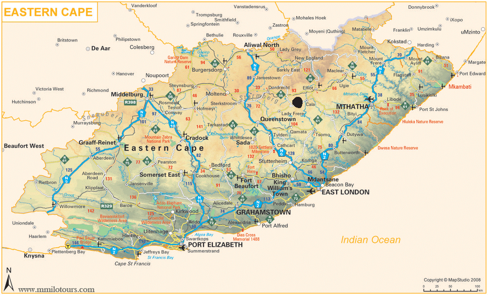 Cala (GPS Coordinates 31.523°S 27.698°E) is next to the black dot on this map of the Eastern Cape (EC) Province and in the context of various provinces in South Africa.